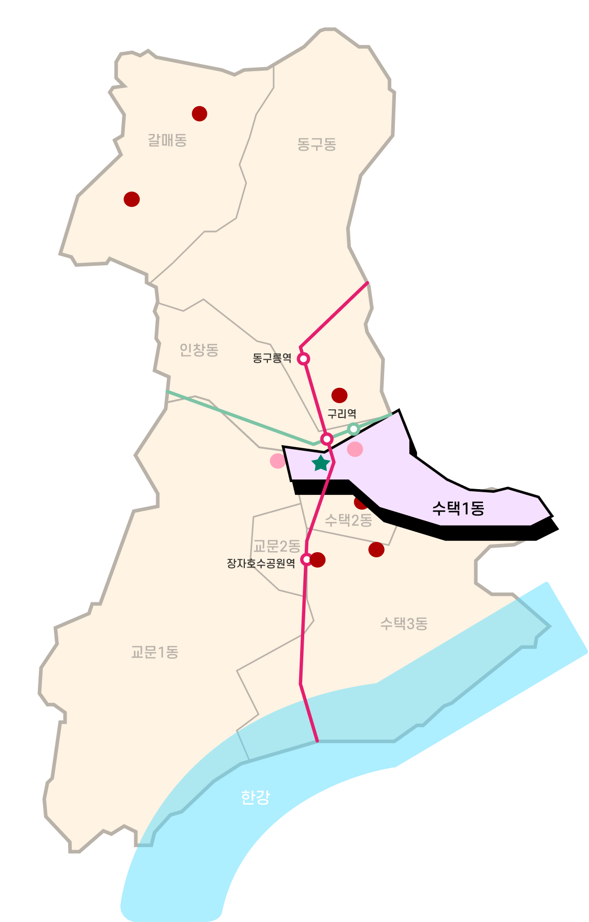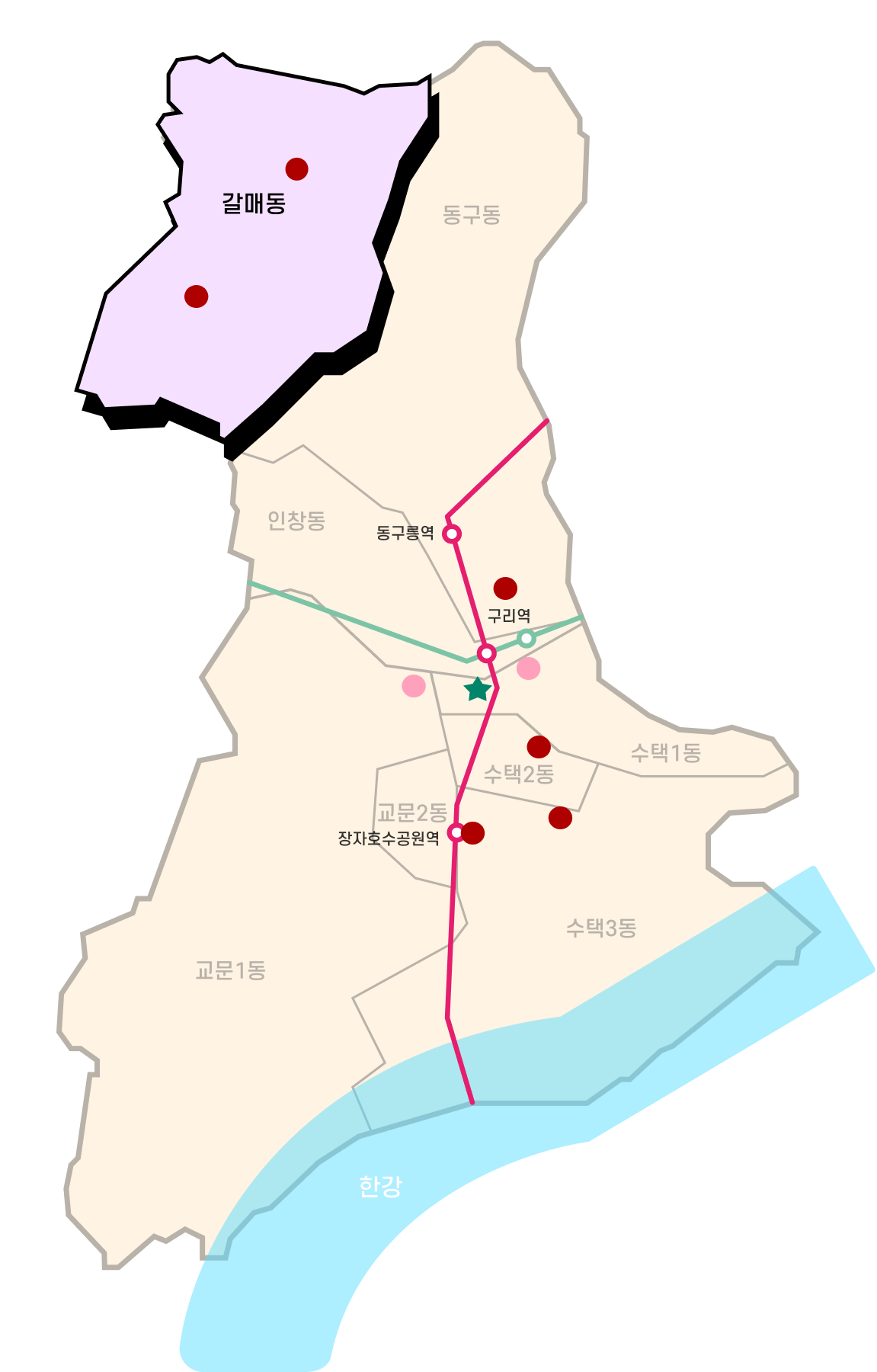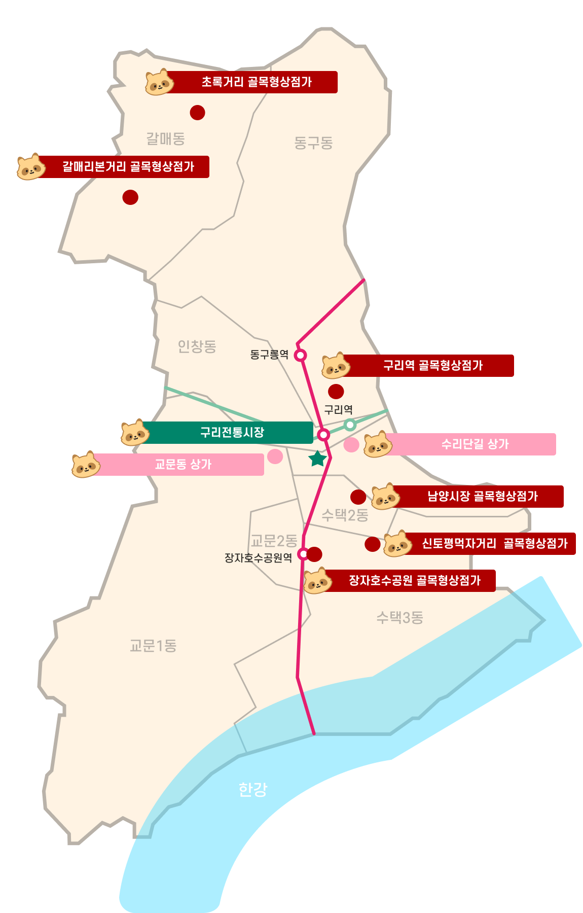 구리역 골목형상점가는 인창동 내 거대한 아파트 단지가 인접해있는 상권으로 주민들이 즐겨찾는 상권입니다. 도보 3분 거리에 구리역, 롯데백화점이 있어 유동인구가 많아 음식점, 카페, 학원, 병원 등 실생활에 밀접한 상점들이 많은 인근 주민과 방문객들이 좋아하는 최적의 상권입니다.